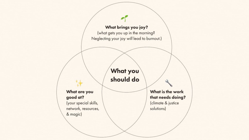 Finding your place to be active in the transition to a just and livable future might seem quite daunting. Where do you even start?! The episode suggests drawing yourself a Venn diagram to help you narrow it down – and who doesn’t like a good, applicable Venn diagram!